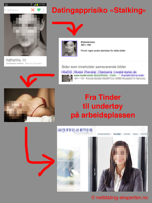 Når noen har fått tak i et fornavn og et Tinder-bilde kan de finne Twitter-, Instagram- eller LinkedIn-profilen og alle andre profiler vedkommende har på nett ved hjelp av Google Bildesøk. Fra disse profilene får forfølgeren tak i hele navnet og kan deretter finne vedkommende direkte på Facebook eller i verste fall på hans eller hennes arbeidsplass